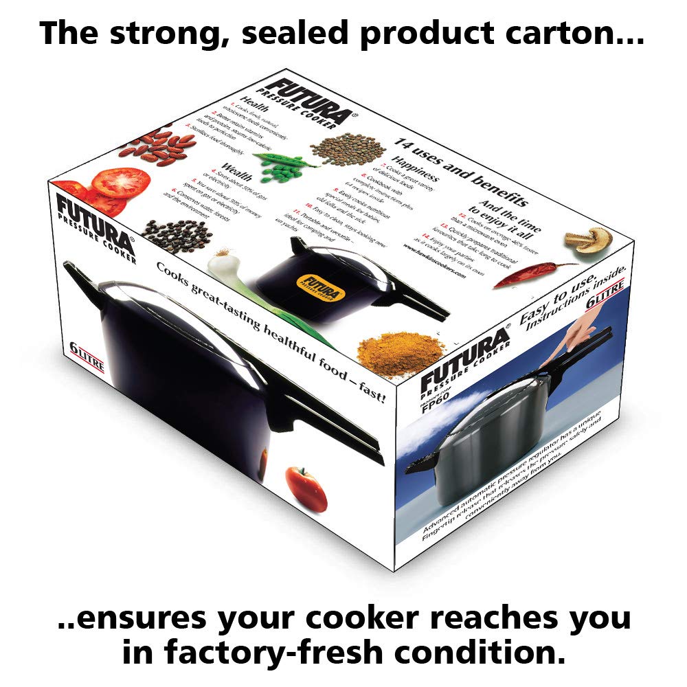 A beautiful combination of form and function, Futura is the only pressure cooker in the world to have been displayed by The Museum of Modern Art, New York. Futura cooks on average 46% faster than a microwave oven. The beautiful, durable black finish given by 60 microns thick hard anodising has two benefits. It makes the pressure cooker absorb heat faster making it more energy-efficient. And the pressure cooker stays looking new for years. The unique pressure regulating system gives you the convenience of finger-tip pressure release and prevents clogging of the steam vent. The double-thick base stays flat, heats evenly and is ideal for light frying before pressure cooking. Each Futura features an inside-fitting lid. This design is inherently safer than conventional cookers. Thus it is pressure-locked for safety – like a jetliner door! The safety valve is located under the lid handle bar so that when it operates the steam is safely deflected downwards.