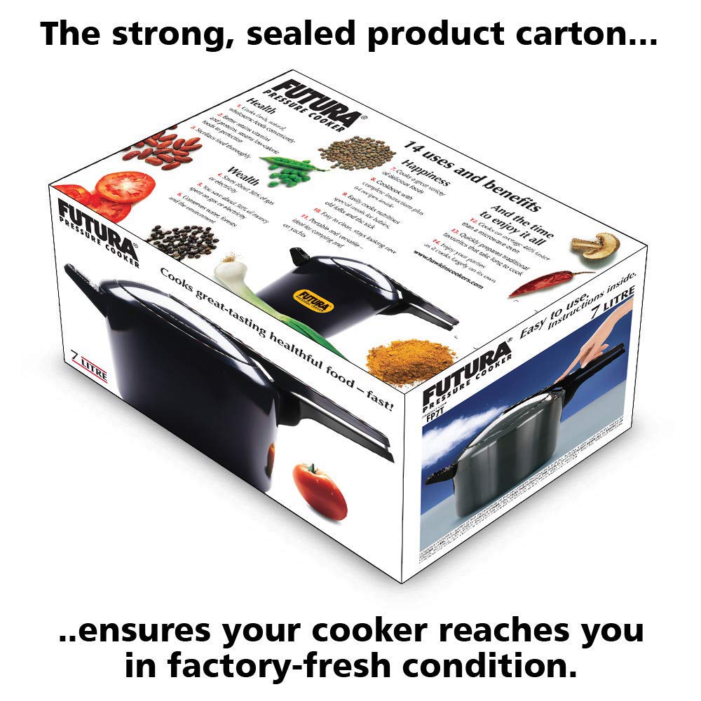 A beautiful combination of form and function, Futura is the only pressure cooker in the world to have been displayed by The Museum of Modern Art, New York. Futura cooks on average 46% faster than a microwave oven. The beautiful, durable black finish given by 60 microns thick hard anodising has two benefits. It makes the pressure cooker absorb heat faster making it more energy-efficient. And the pressure cooker stays looking new for years. The unique pressure regulating system gives you the convenience of finger-tip pressure release and prevents clogging of the steam vent. The double-thick base stays flat, heats evenly and is ideal for light frying before pressure cooking. Each Futura features an inside-fitting lid. This design is inherently safer than conventional cookers. Thus it is pressure-locked for safety – like a jetliner door! The safety valve is located under the lid handle bar so that when it operates the steam is safely deflected downwards.