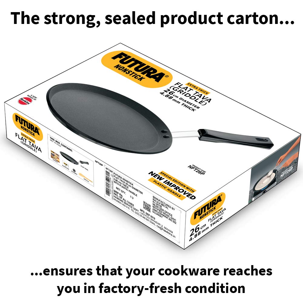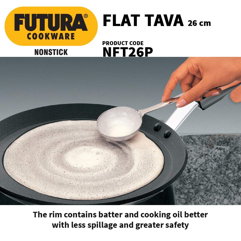 Futura Flat Tava can cook roti (flat breads), phulka (puffed unleavened bread) and paratha (layered unleavened breads) - all staple foods in India. Flat Tava can also well cook cutlets, eggs, pancakes, French toasts, griddle cakes and the like. In addition, the flat cooking surface is particularly useful in making foods using liquid batter that require careful spreading, and helps retain the shape more evenly. The cooking surface is made of PFOA-free with a unique patented process by which high quality nonstick coating (made in Germany) is locked firmly into the tough Hard Anodised surface underneath. Therefore, the nonstick, if used properly, would last longer than the ordinary nonstick.