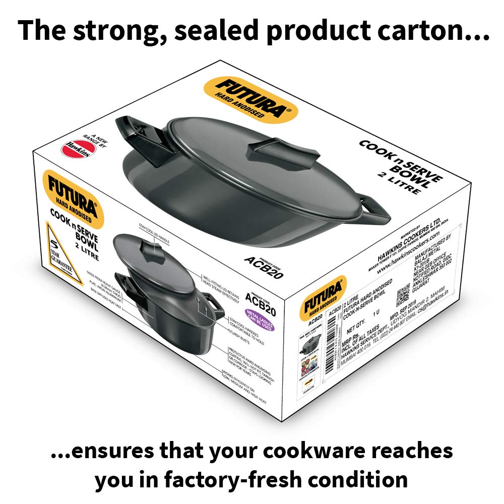 Hard Anodising was first developed by Russian scientists to produce a metal surface tough enough for space travel. The same technology is used by Futura to make Hard Anodised Cookware.The 4.06 mm extra thick hard anodised base allows you to use less oil for more healthful cooking.The lid handle is uniquely designed - it is long enough to accommodate the thumb and fingers comfortably when gripped. The Cook-n-Serve Bowl is suitable for domestic gas, electric, ceramic and halogen cooktops.
