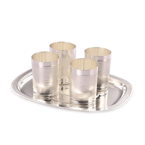 This 4 pc glass set is here to help you serve water and other cold drinks to your guests and family. this glass set is here to add finese to your home as it look great. plated with pure silver and as it comes with designer box packaging it is perfect choice for gifting.Tray (27.5x21.5) Glass (9x6)