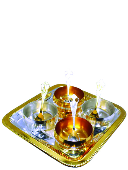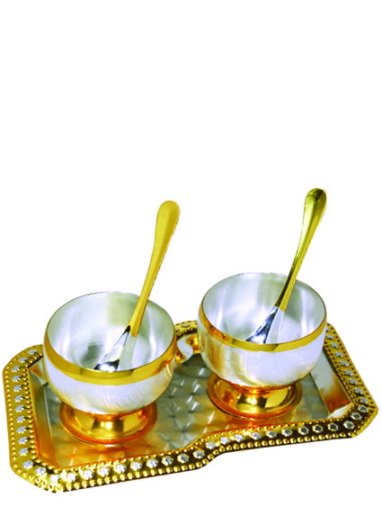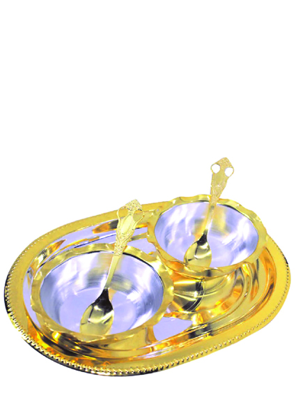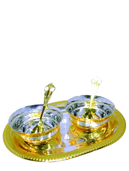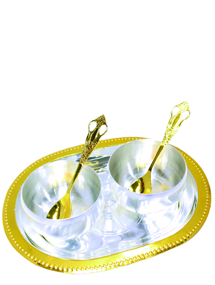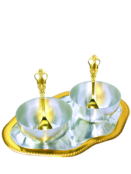 Desiner Gold Silver Plated New Capsule Tray(M) 2 Neelam Bowl(B) and 2 Spoon Set