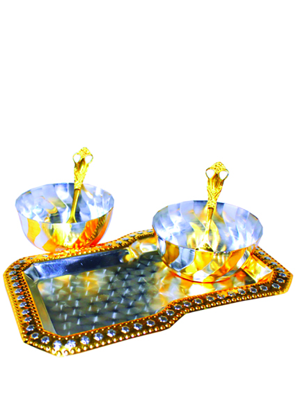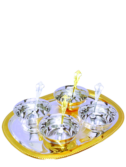 Desiner Gold Silver Plated Lazer Tray 4 Matti Pari Bowl 4 Spoon Set
