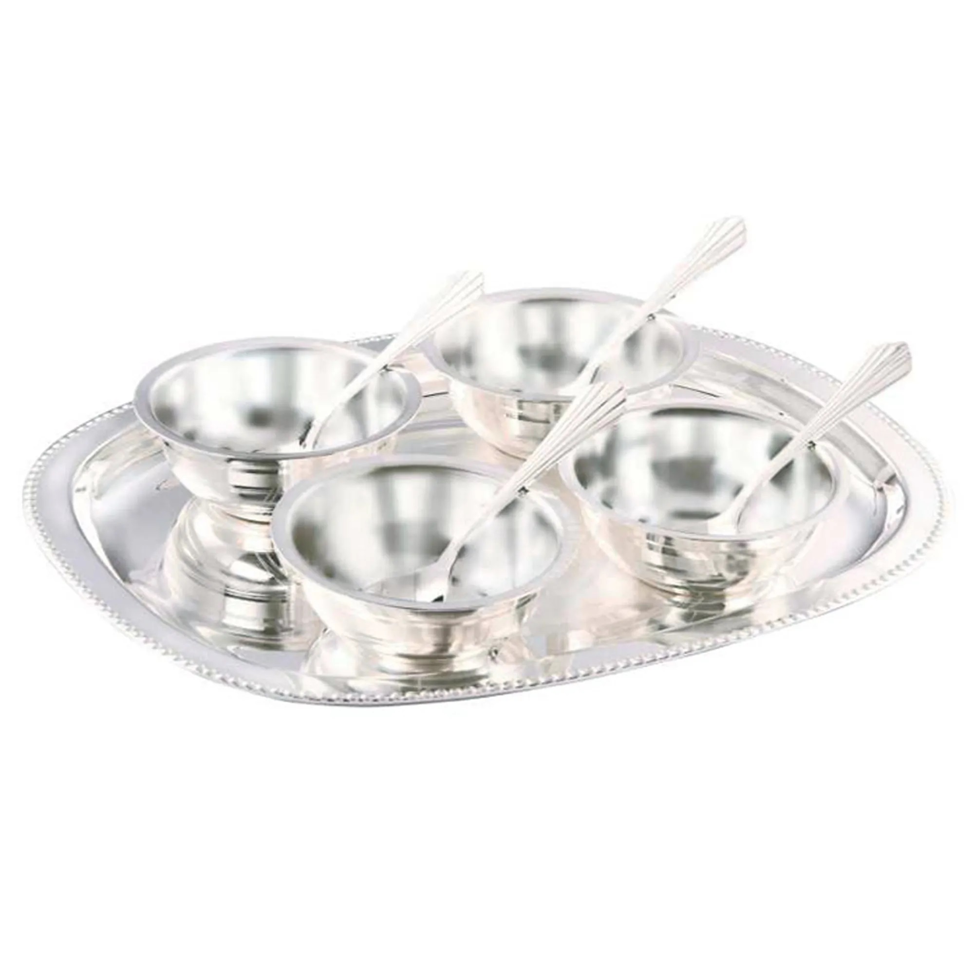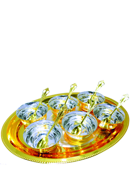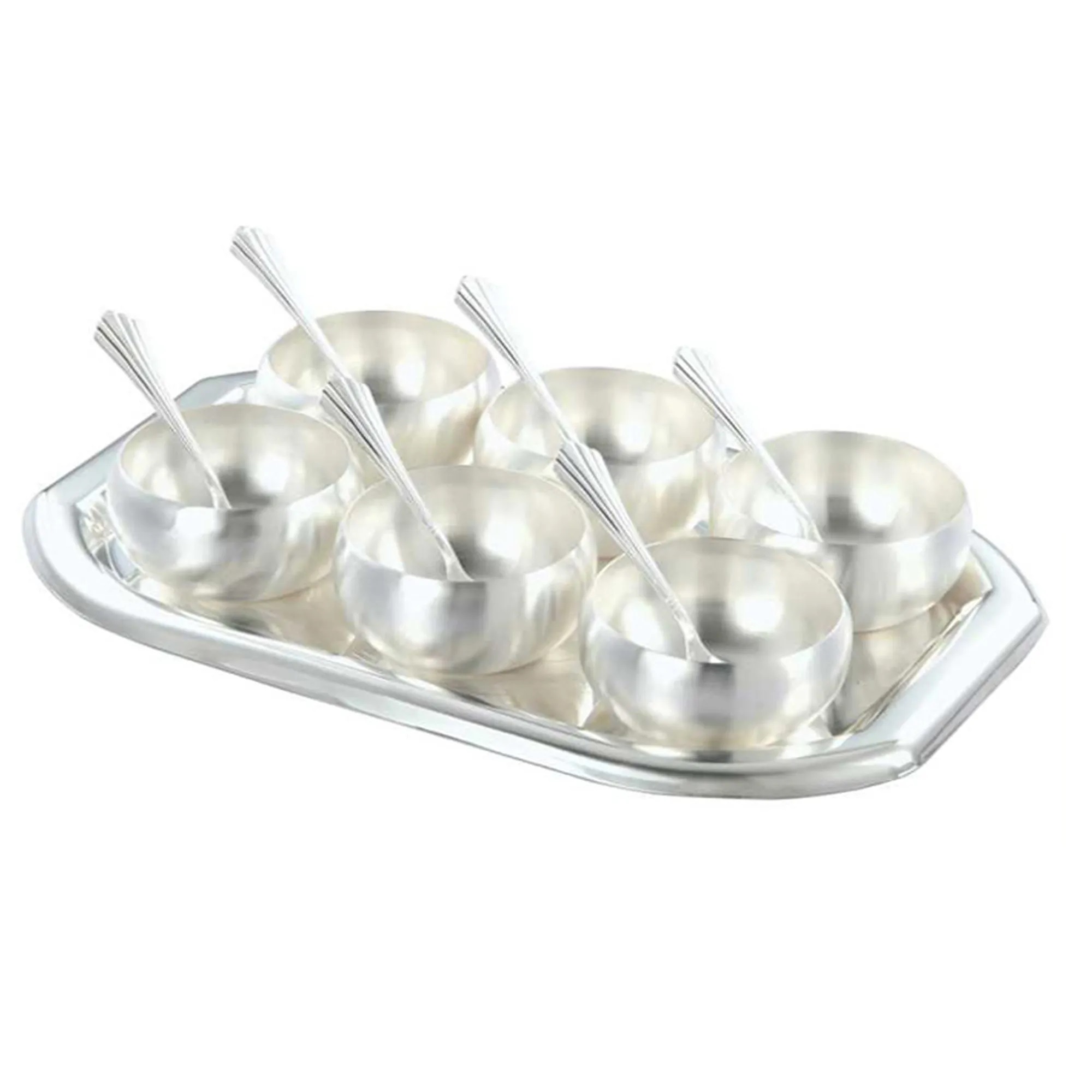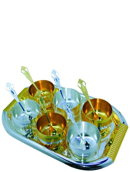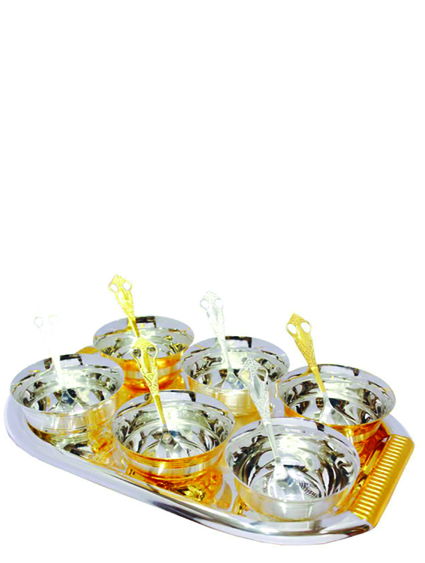 Desiner Gold Silver Plated Oval Tray 6 Pari Bowl 6 Spoon Set