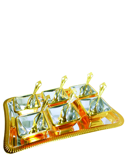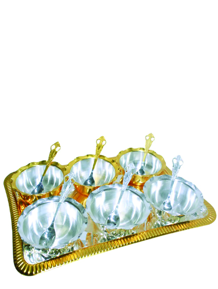 Desiner Gold Silver Plated King Tray 6 Sq. Deep Bowl 6 Spoon Set
