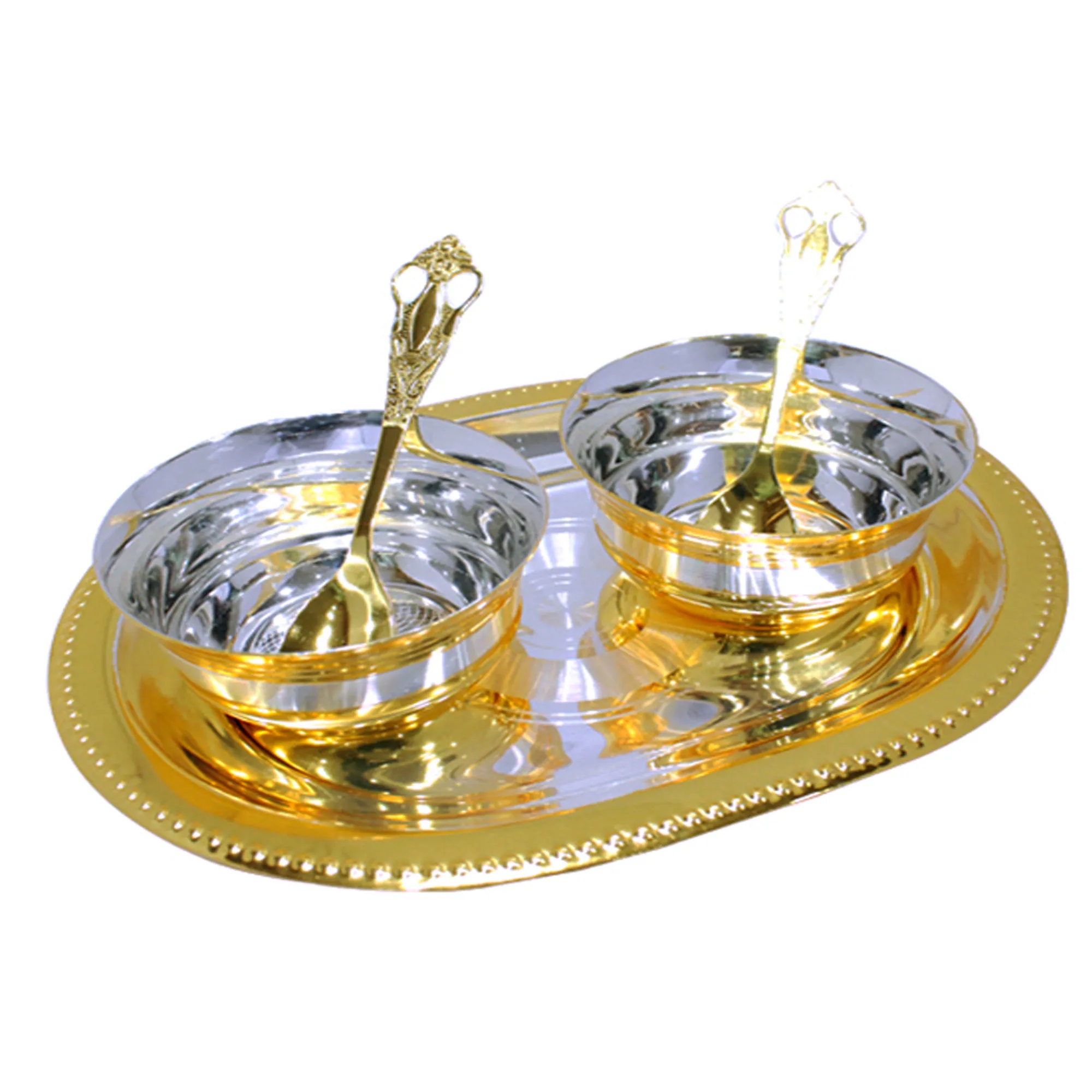 Desiner Gold Silver Plated Oval Tray 6 Pari Bowl 6 Spoon Set