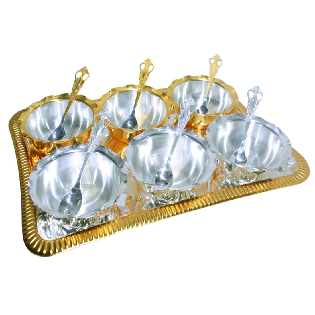 Desiner Gold Silver Plated King Tray 6 Sq. Deep Bowl 6 Spoon Set
