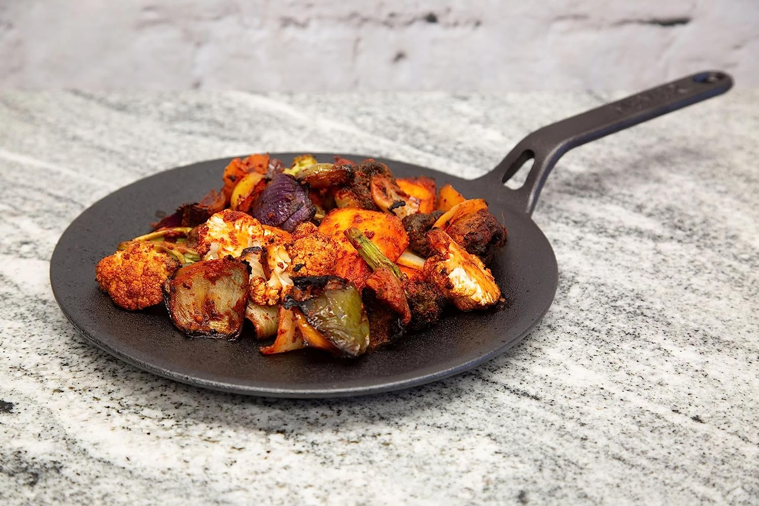 The tawa comes with a Hassle-free LIFETIME WARRANTY Totally Toxin-free – No ENAMEL, No CHEMICAL coating on the inner or outer surface. Pre-seasoned with 100% Vegetable Oil – Regular seasoning creates a chemical free natural non-stick surface for low oil cooking.,Uni-body ‘one-piece’ design – free of any screws or weld joints. Suitable for gas stovetop. Not compatible with Induction Comes with a canvas grip for easy handling.