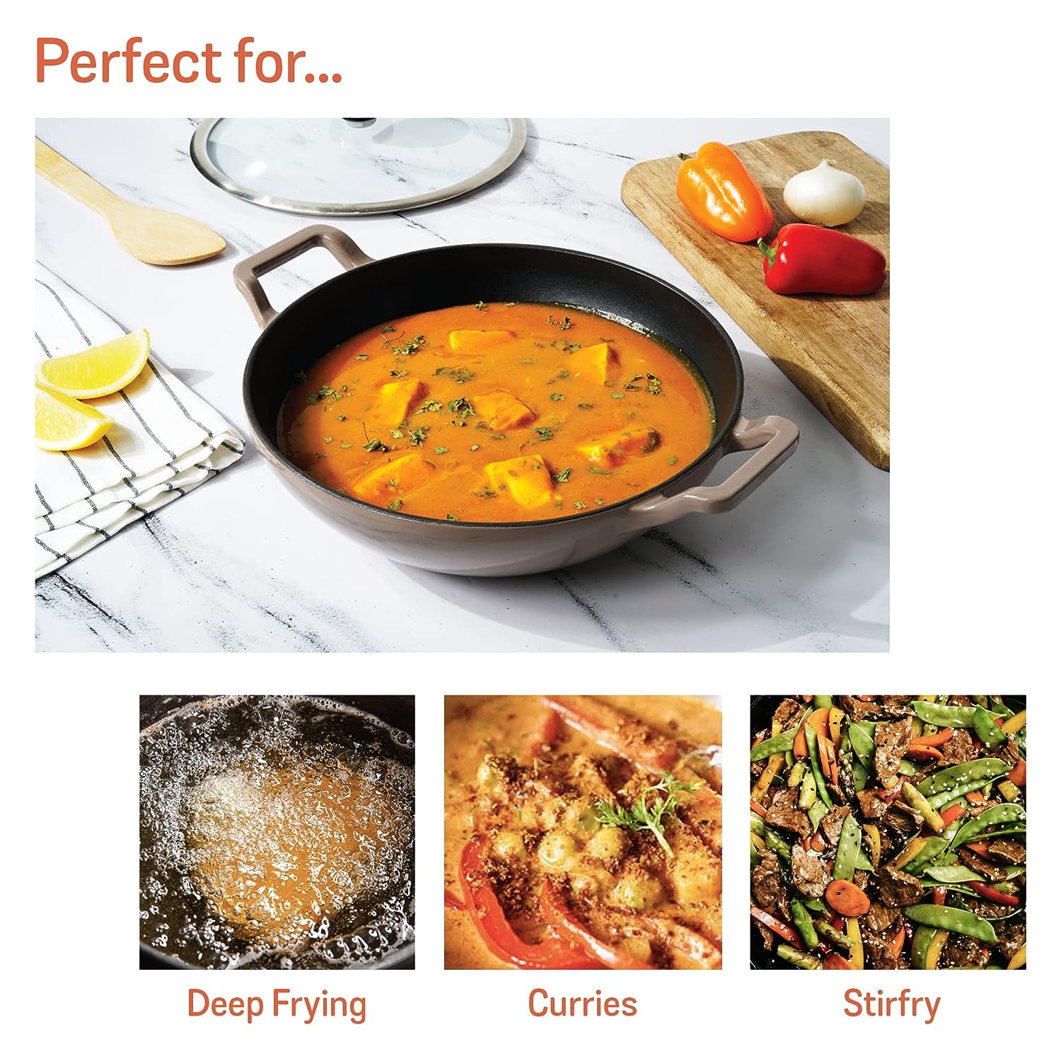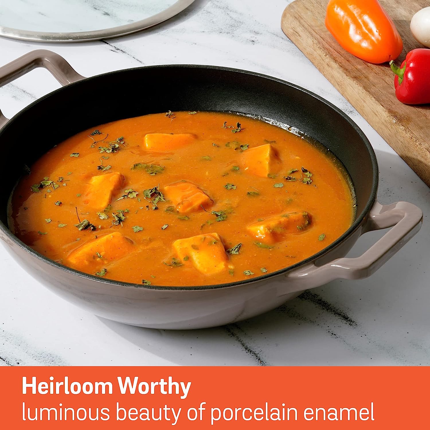 Heirloom Worthy: A heavy-duty cast ironi Kadai that blends the benefits of sturdy cast iron with the luminous beauty of porcelain enamel coating to offer a lifetime of seamless cooking.,Chip & Crack Resistant Porcelain Enamel Coating: Made from glass particles that are fused to the raw cast iron to create a non-porous and smooth protective layer. The superior enamel coating is non-reactive and renders resistance against rust, crack, and chip. It promotes impressive food release and is effortless to clean,Exceptional Heat Retention And Even Heating: It is ideal for sautéing, simmering, slow cooking, and more. Unparalleled cooking experience, low maintenance, and ability to withstand regular wear and tear; making cooking a cherished memory.