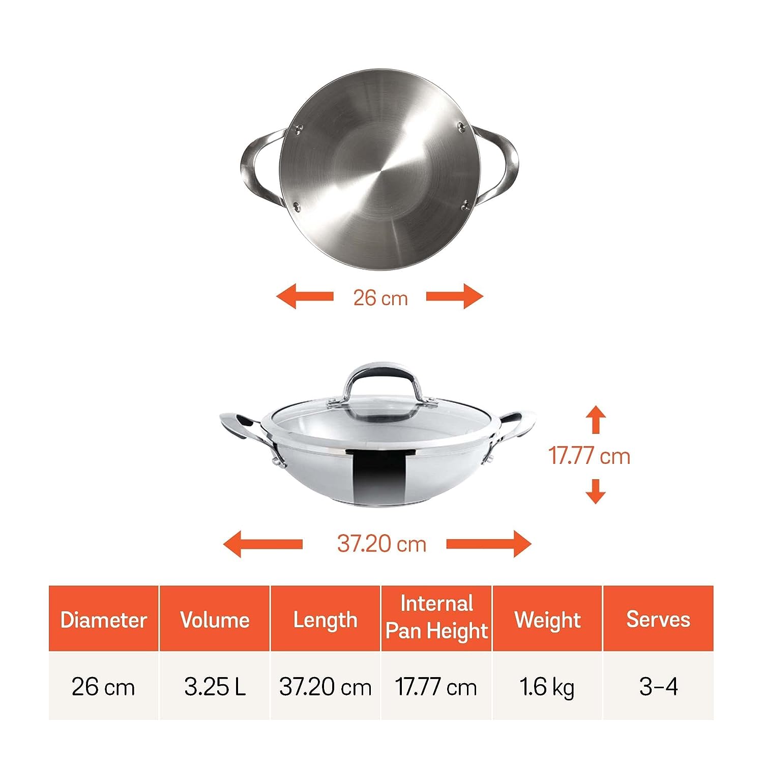 100% Nickel Free Thick Stainless Steel Kadai with Glass Lid. Metal utensil safe, Oven and Dishwasher safe,Superior pitting resistance compared to ordinary stainless steel Cookware. Durable Stainless Steel body + Faster Heating 5mm thick Aluminium sandwich base,No hot spots - Cooks evenly as the thick Aluminium core distributes heat uniformly,Shatter-resistant tempered glass - Seals heat & moisture, allows you to monitor food. Riveted ‘stay cool’ handle with comfortable silicone grip