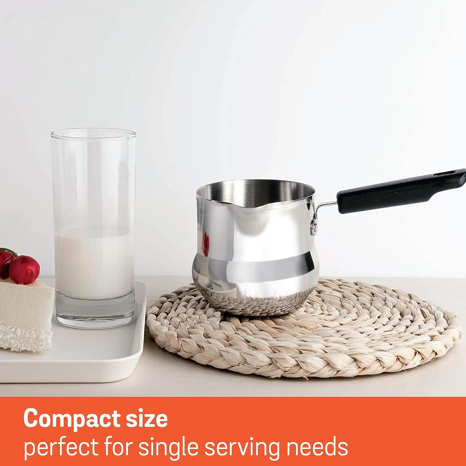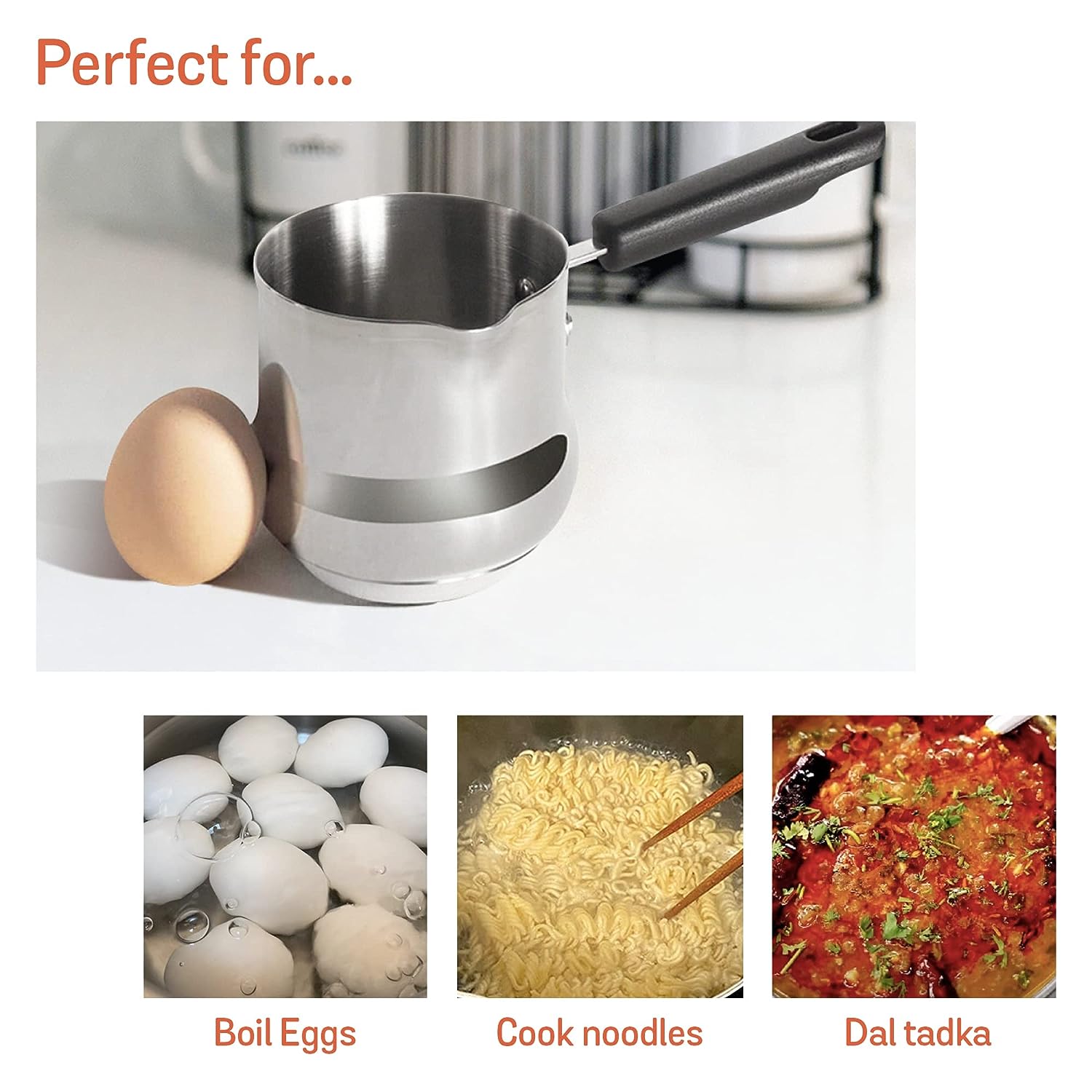 100% Safe for you & your family: Made with nickel-free stainless steel, the Milk pan is completely safe for cooking, especially for preparing baby food. The use of thick aluminum core ensures fast and uniform heating.,Kitchen Workhorse: This mini pot is truly multipurpose. Perfect to warm milk, prepare soup, boil eggs, cook noodles, melt butter, rustle up tadka for daal, and much more. Its compact size makes it ideal to prepare baby food, reheat leftovers, or prepare food for a single serving,Flavour preservation: This stainless steel cookware doesn’t impact the flavor of food as it doesn’t leach off any metallic properties into food. The pouring spout ensures mess-free draining making it a perfect milk pan