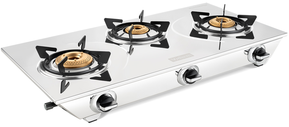 ? Viva SS Frameless 3 Burner Stainless Steel Gas Stove (Patent Pending) - Extra Large Cooking Surface & Widely Spaced Burners to accommodate Large Vessels with Jumbo, Medium & Small Brass Burners.